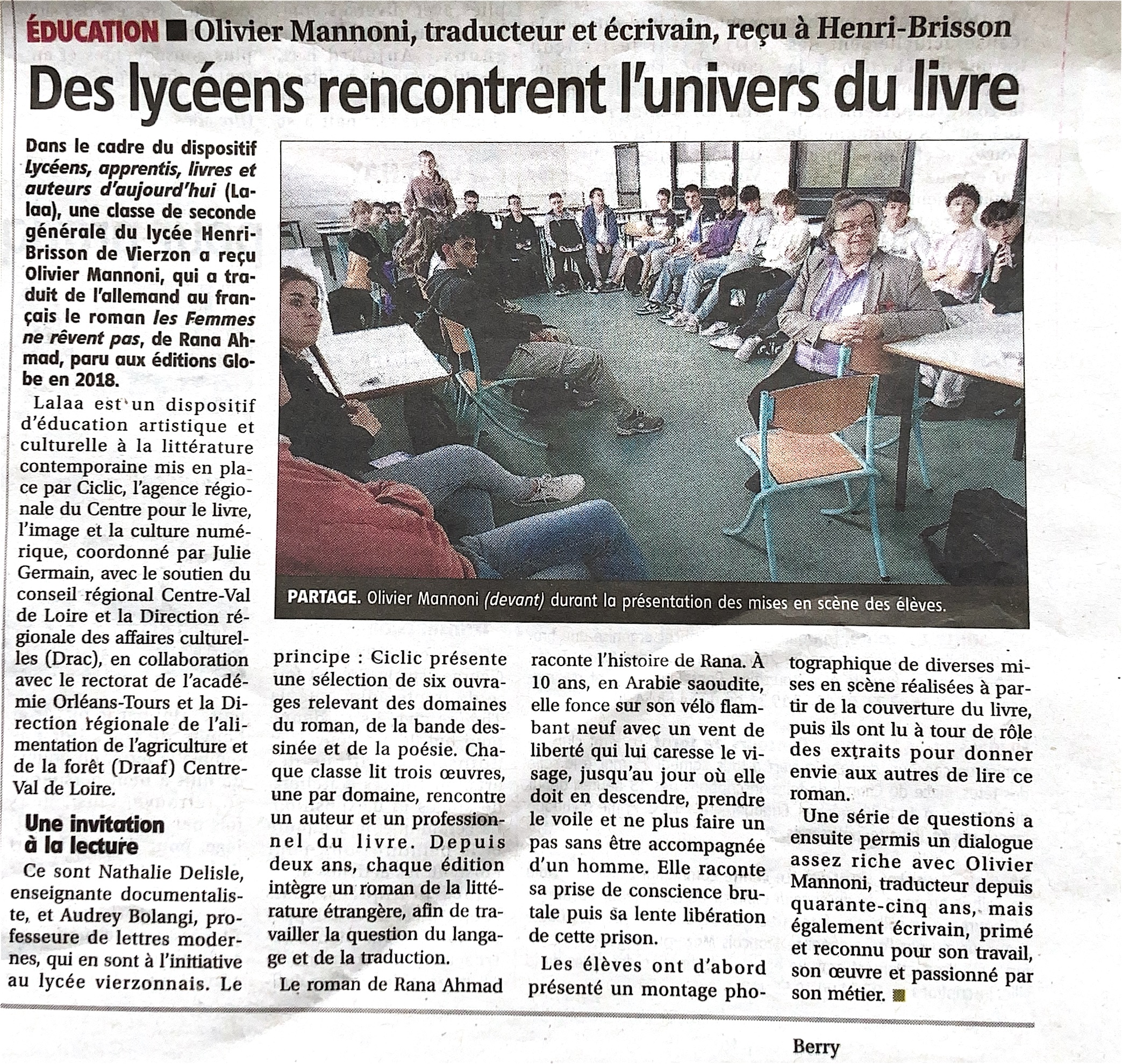 Le jeudi 16 mai 2024, les élèves de la classe de 2 D2 ont rencontré et échangé avec Olivier Mannoni le traducteur du roman de Rana Ahmad, Ici, Les femmes ne rêvent pas, récit d’une évasion.
